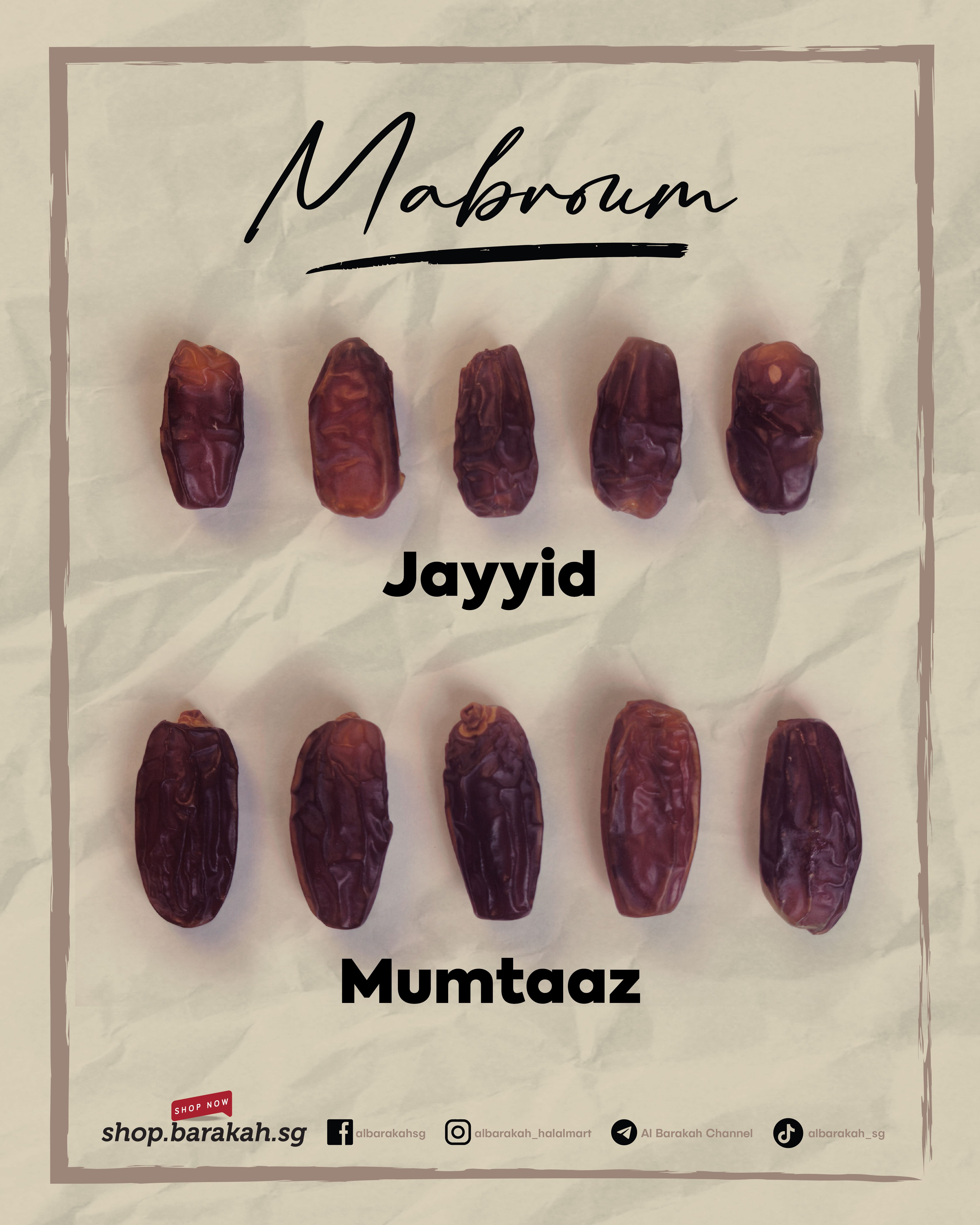 Mabroom is a chewy type of date fruit from a city called Al Ula in Saudi Arabia. It is mainly sold and marketed in Madinah al Munawwarah. It has a very good mix of caramel like sweetness, making it a favourite amonght many. Mabroum is differentiated by its elongated shape and reddish purple tone.