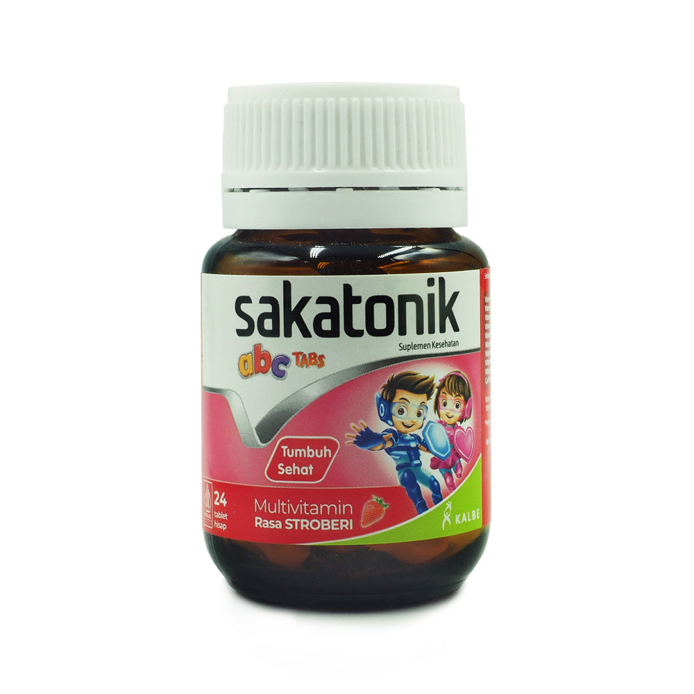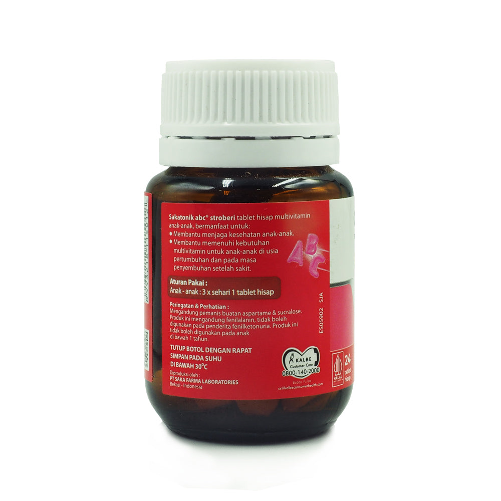Sakatonik A-B-C Strawberry tablet hisap multivitamin anak-anak berperisa stroberi.