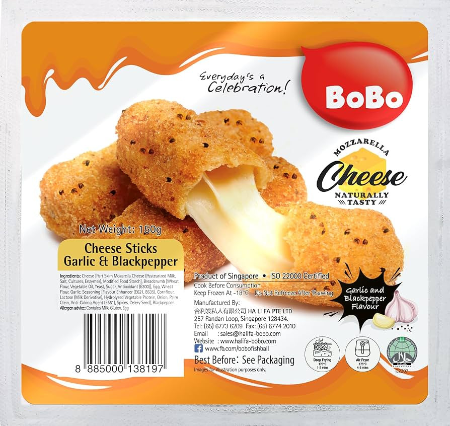 Treat yourself to a delicious snack with Bobo Mozzarella Cheese Sticks Garlic & Blackpepper. Each stick is coated with a golden, crispy crust and filled with smooth, melty mozzarella cheese, infused with the irresistible flavors of garlic and black pepper. Perfect as an appetizer, party snack, or anytime indulgence. Simply bake or fry for a warm, cheesy delight that melts in your mouth.